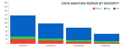 The graph below appears to show that some critical issues have slipped through the cracks, as they have been waiting for over a year to be repaired. It could also indicate that the maintenance group is too busy to address everything.