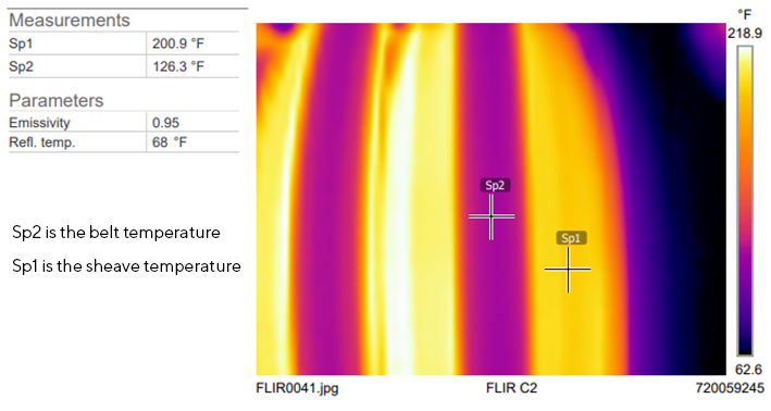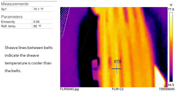 The following is an image of the same fan design with the belts properly tensioned. The setup is slightly different too because the motor sheave is just a 5-groove sheave. One motor has the sheave set further out on the motor shaft to line up with 5 grooves on the outboard side of the fan sheave. The other motor has the sheave set closer to the bearing to line up with the inboard grooves of the fan sheave. If you look at the overall temperatures of the belts, they are running much cooler. If you look closely at the image you can see the sheave is also running cooler, than the temperature of the belts.