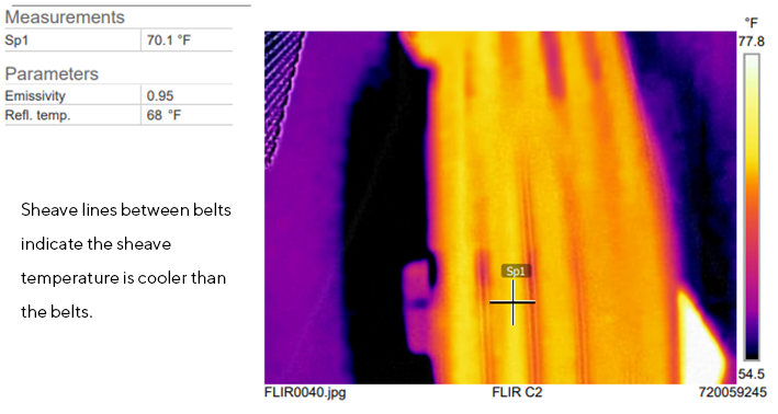 The following is an example of where a chirping belt was a more significant issue than just a little noise. The fan was making a little noise and using a strobe you could see some slapping. In the end, I had seen and heard worse, and it was one that had been written up for almost two months when I took the infrared (IR) image.