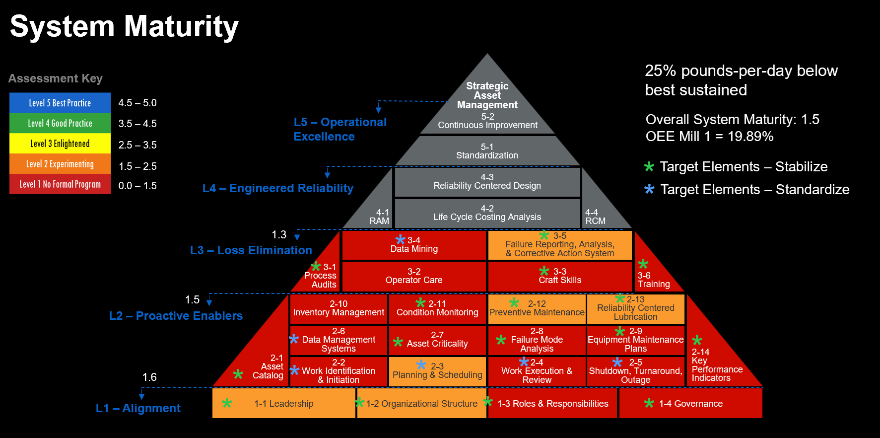 So we proceeded to conduct an in-depth evaluation to understand the current state and establish a health baseline, measuring data like system maturity in terms of asset maintenance and reliability. Our assessment tools revealed the need to stabilize and standardize work practices to achieve sustainability, while also getting people to behave differently. The next three months were spent setting the future state in motion, starting from a system maturity level of just 1.5 (shown below).