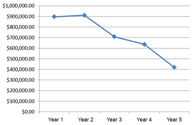 The goal of an RCM program is to seek an optimal mix of condition-based actions, other time- or cycle-based actions, or run-to-failure to reduce overall costs (maintenance and operations) to maximize organizational readiness (facility, mission). One step of the development of the equipment maintenance strategies was to analyze the preventive maintenance (PM) program. We identified and eliminated tasks that were attempting to detect failure modes, which could be managed more efficiently via condition monitoring technologies. The charts below demonstrate the initial savings in dollars and man-hours as the program matured, and tasks were eliminated in year three and four.