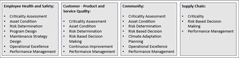 Asset condition (health or likelihood of failure), along with criticality, determines asset risk (Criticality * Condition). Given that ESG factors are key drivers in this formula, an organization’s ability to understand its assets in terms of risk is essential and a measure of its ESG maturity. From a broader perspective, it is a key determinant of an organization’s AM maturity and, more importantly, its ability to make rigorous and transparent risk-based decisions.